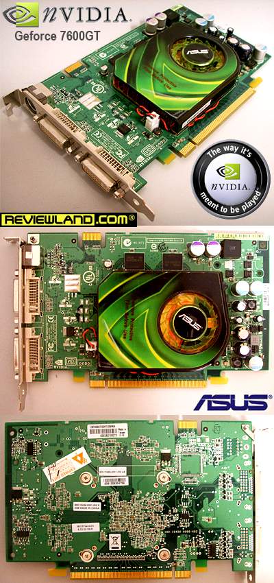 Produsen motherboard no.1 di dunia ini memilih menggunakan nvidia reference board design untuk produk 7600GT-nya. Dengan kata lain tidak ada diferensiasi yang dilakukan ASUS dalam hal layout board , pendingin, chip memory, dan clock speed. ASUS melakukan diferensiasi dalam hal pemberian bundle software (aplikasi video monitoring, utility Asus splendid, game King Kong, dll) Board yang digunakan ASUS adalah board referensi warna hijau berlogo nvidia dengan pendingin referensi yang tidak menutupi chip memory Samsung yang digunakan. Clock default juga memilih mengikuti referensi standard, yaitu 560/700(1400) untuk GPU dan memory.