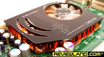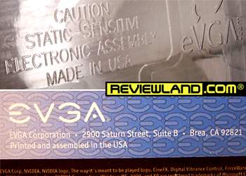 Dari semua videocard yang diuji, ini adalah satu-satunya produk asal Amerika. Pada kemasannya tertera tulisan "Made in USA", namun boardnya tentu saja bukan buatan Amerika karena juga menggunakan nvidia reference board yang sama seperti ASUS dan Pixelview. EVGA merupakan produsen videocard yang cukup populer di Amerika, hal ini bisa dimaklumi karena pusatnya memang bermarkas di California, sehingga dari sisi kualitas boleh dibilang sesuai standar Amerika. Oleh karena itu produsennya berani memberi lifetime warranty (sekalipun distributornya di indonesia hanya menggaransi 1 tahun saja). Sekalipun board yang digunakan standard referensi nvidia, namun EVGA melakukan diferensiasi dalam hal pendingin, chip memory, dan patokan clock standard. Berbeda dengan pendingin referensi, pendingin EVGA lebih besar sehingga ikut menutupi (mendinginkan) chip memory.
