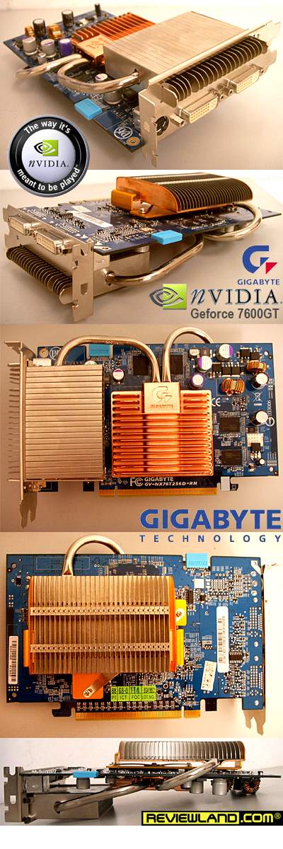 Sebagai produsen motherboard no.2 di dunia, Gigabyte memilih tidak menggunakan board hijau referensi Nvidia, namun memproduksi board buatan mereka sendiri yang tentu saja berwarna biru khas Gigabyte. Meski layout board Gigabyte 7600GT berbeda dari referensi standard nvidia, namun secara fisik, panjang cardnya masih sama dengan standard nvidia, sehingga tidak akan berbenturan dengan komponen lain di motherboard. Sebagai diferensiasi tambahan di sisi non-hardware, Gigabyte memberikan bonus game Serious Sam II . Untuk urusan clock speed, mereka masih menganut refererensi standard nvidia yaitu 560/700(1400). Di sisi hardware, selain diferensiasi dalam hal board layout, Gigabyte juga menggunakan design pendingin jenis heat-pipe tanpa fan yang mereka namakan Silent-Pipe II. Heatsink dual-slot dengan tampilan keren ini dibuat dengan kualitas material terbaik. Tampilan pendingin yang keren inilah yang menjadi daya tarik utama Gigabyte 7600GT.