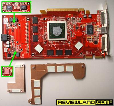 Bagian komponen voltage regulator pada videocard ATI kelas menengah-atas (x1800 dan x1900) terkenal menghasilkan panas berlebih, sehingga juga harus didinginkan oleh heatsink. Oleh karena itulah ukuran heatsink x1950 Pro melebar dan memanjang hingga ikut menutupi (mendinginkan) chip memory serta komponen voltage regulator. Materi heatsinknya bukan dari copper melainkan alumunium yang disepuh warna kuning keemasan.
