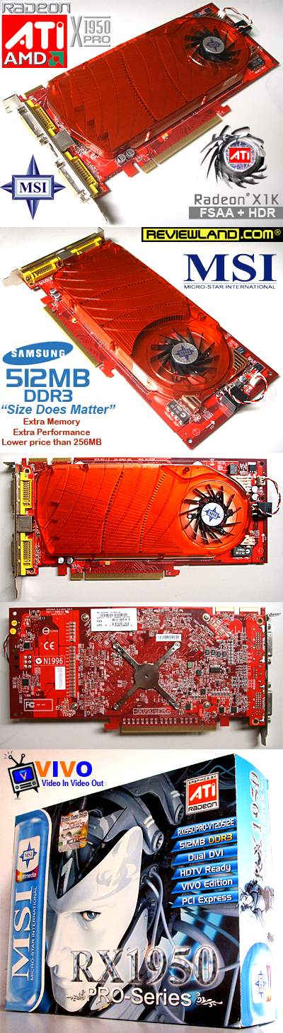 Seperti kebanyakan X1950 Pro lainnya, videocard besutan MSI ini juga dibekali chip ATI Rage Theater yang membuatnya memiliki fitur VIVO (Video In Video Out). Untuk memanjakan pengguna yang ingin memanfaatkan fitur VIVO, MSI menyertakan External VIVO Port dengan design cantik, berbeda dengan X1950 Pro merk lain yang hanya dibekali kabel VIVO kacangan belaka. Sekalipun sarat fitur extra dengan harga paling miring, kemampuan overclock MSI X1950 Pro ini ternyata sangat mengecewakan. Pada dasarnya chip ATI RV570 memang tidak memiliki kemampuan overclock yang tinggi. Namun X1950 Pro garapan MSI ini memiliki kemampuan overclock GPU yang lebih rendah daripada X1950 Pro besutan HIS. Overclock maximal untuk GPU dan memory MSI X1950 Pro cuma mencapai 620/769(1539) saja. Ini berarti kenaikan GPU yang cuma sebanyak 8% saja. Sedangkan kenaikan memorynya sama persis seperti X1950 Pro HIS yang juga menggunakan chip buatan Samsung, yaitu 15%. Namun kekalahan dalam hal overclock GPU, dikompensasi oleh MSI dengan jumlah memory yang besar. Memory sebesar 512mb mampu memberikan peningkatan performa yang cukup signifikan di banyak game. Oleh karena itu pada sebagian besar benchmark, X1950 Pro 512MB besutan MSI ini bahkan mampu mengalahan X1950 Pro 256MB yang dioverclock lebih tinggi.